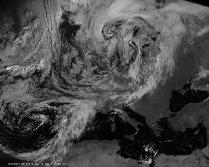 Das heutige Satellitenbild zeigt, dass von Nord- bis nach Mitteleuropa verbreitet viele Wolken durchziehen, die zeitweise für Schauer sorgen. Auch auf der Iberischen Halbinsel bringt ein Tief meist viele Wolken und zeitweise Schauer. Freundlicher ist es dagegen im übrigen Mittelmeerraum und auch in Südosteuropa.