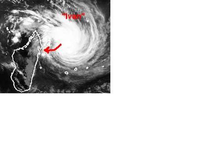 Auf dem Satellitenbild von Freitag früh befindet sich der Tropensturm 'Ivan' östlich von Madagaskar. Zurzeit erreicht er mittlere Windgeschwindigkeiten von 139, in Böen 167 km/h. Berechnungen zufolge soll er sich noch etwas verstärken, und auf den Norden von Madagaskar zuziehen. Sein Endziel ist noch unklar. (Bildquelle: NERC Satellite Receiving Station, Dundee University, Scotland, http://www.sat.dundee.ac.uk/)
