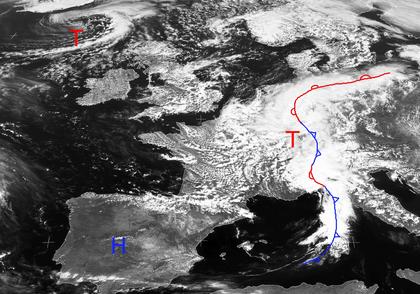 Ein Tief erstreckt sich mit seinem Frontensystem und der dazugehörigen Bewölkung von Nordpolen über Deutschland bis zu den Alpen und ins westliche Mittelmeer. In diesem Bereich fällt auch häufig Regen. Nordwestlich davon haben sich mit einer nördlichen Strömung Schauerwolken gebildet. Über Südskandinavien liegt noch die dichte Bewölkung eines alten Tiefs. Auch vor Island erkennt man die Struktur eines Tiefs. Dagegen konnte sich über Spanien ein Hoch aufbauen, dass seinen Einflussbereich nach Norden ausdehnt, aber nicht stabil bleibt. (Bildquelle: NERC Satellite Receiving Station, Dundee University, Scotland, http://www.sat.dundee.ac.uk/)