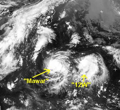 Über dem westlichen Pazifik liegen zur Zeit zwei tropische Stürme. Der eine von ihnen mit dem Namen 'Mawar' zieht unter Verstärkung nach Norden und nimmt Kurs auf Japan, nach den neuesten Berechnungen erreicht er im Laufe der nächsten Woche mit Windgeschwindigkeiten von 170, in Böen bis 200 km/h die Südküste von Honshu. Östlich der nördlichen Marianen baut sich der tropische Sturm '12W' auf, er verlagert sich nach Nordwesten, sein Endziel ist noch unklar.