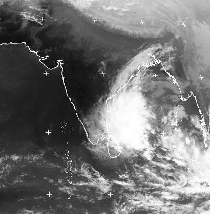 Bei Sri Lanka liegt ein Zyklon, der morgen in Böen Windstärke 11 erreicht. Er bringt auch ergiebige Regenfälle. Sonst ist es über dem indischen Subkontinent meist wolkenlos.