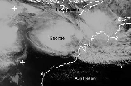Der Zyklon 'George' liegt derzeit knapp nordwestlich von Australien im Indischen Ozean. Seine Windgeschwindigkeiten in Böen betragen im Moment 160 km/h. Auf seinem Weg nach Westen soll der Zyklon sich weiter verstärken.
