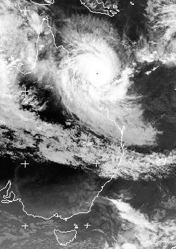 Der Zyklon 'Larry' hat sich gegenüber gestern deutlich verstärkt. Er liegt jetzt an der Küste von Nordqueensland, zwischen Cairns und Townsville mit mittleren Windgeschwindigkeiten von 150 km/h und Böen bis 175 km/h. Er wird sich noch etwas verstärken, bevor er morgen Vormittag ins Landesinnere zieht, wo er sich dann rasch abschwächt. Zuvor bringt er der Küstenregion jedoch neben dem Sturm auch kräftige Regenfälle.
