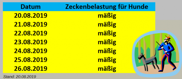Bei milden bis warmen Spätsommertemperaturen und überwiegend trockener Witterung geht es mit der Zeckenbelastung im Verlauf dieser Woche etwas nach unten. Die Zeckenrisiken im Unterholz sind für diese Jahreszeit als normal einzuordnen.