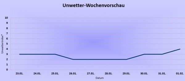 Das Unwetterrisiko bleibt in der laufenden Wetterwoche weitgehend gering. Unter dem Einfluss eines Hochs über dem östlichen bis südöstlichen Europa gelangt zunächst noch ziemlich kalte, im Wochenverlauf jedoch wieder etwas mildere Luft in die Bundesrepublik. Der Wind weht bei dem größtenteils trockenen Wetter meist schwach, an den Küsten und auf den Bergen oft mäßig, teils frisch.