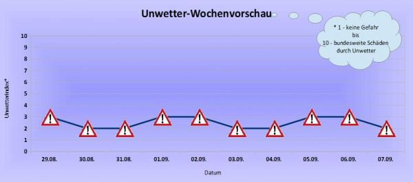 Nach den für Ende August teils rekordverdächtig heißen Sommertemperaturen zeichnet sich für die kommende Woche eher spätsommerliches Wetter mit Temperaturen von meist um 20 bis 25 Grad ab. Die etwas kühleren Temperaturen schränken das mögliche Unwetterpotenzial daher insgesamt ein, da die Wärmeenergie für das Aufsteigen der Luftmassen nur noch im geringeren Maße vorhanden ist. Mögliche Gewitter treten voraussichtlich am ehesten im Alpenvorland auf.