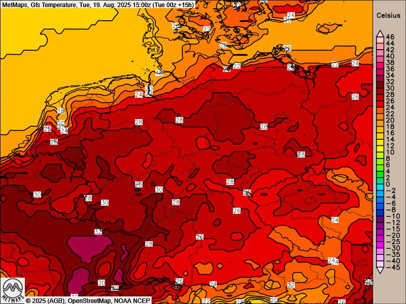 Bevor morgen deutlich kühlere Luft von der Nordsee Deutschland fluten wird, im Süden zieht am Mittwoch zudem Regen herein, können wir uns heute nochmals über einen freundlichen und warmen Sommertag freuen. Im Westen wird mit Temperaturen von 30 bis 32 sogar teilweise ein heißer Tag erreicht..