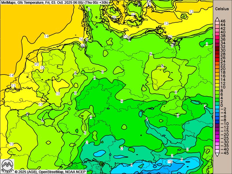Die Wetter- und Bewölkungskarte für Freitagnachmittag sowie die Böen- und Temperaturkarte für Freitagfrüh nach GFS: