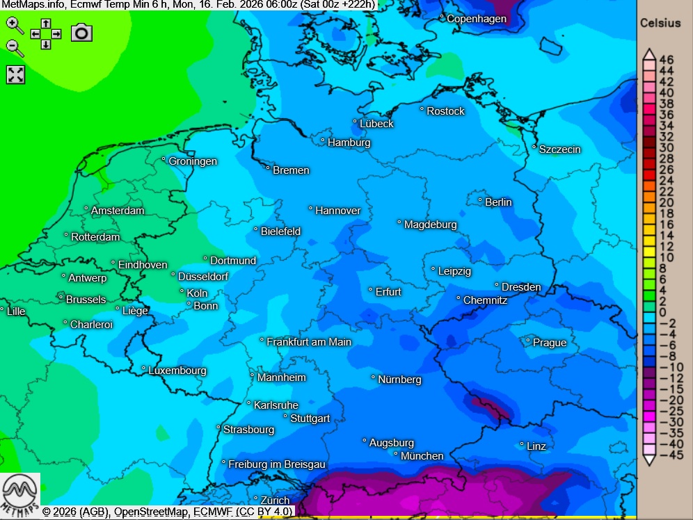 Die Temperaturprognose des europäischen ECMWF für den 16. Februar zeigt die erwarteten 6-Stunden-Minimaltemperaturen: