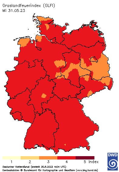 In Sachen Waldbrandgefahr sieht es nur bedingt besser aus - weiterhin im Fokus steht hier der von großer Trockenheit betroffene Osten und Nordosten des Landes. Hier gilt verbreitet die zweithöchste Warnstufe. Aber auch in weiten Teilen Bayerns und Baden-Württembergs besteht ein hohes Waldbrandrisiko.