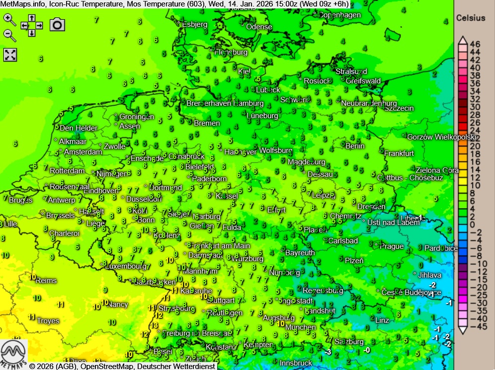 Die Wetter- und Temperaturkarte für 15:00 Uhr nach ICON-RUC: