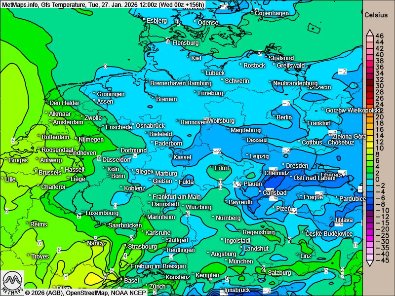 Vor allem das Wettermodell GFS berechnet eine markante Grenzlage über Mitteleuropa. Diese könnte Schnee, Eisregen und Regen bringen – begleitet von Temperaturunterschieden von teils über 10 °C in Mitteleuropa.