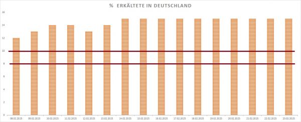 Die Grafik zeigt den von uns berechneten Erkältungs- und Grippeanteil in der Gesamtbevölkerung zwischen dem 08.02. und 23.02.2025.