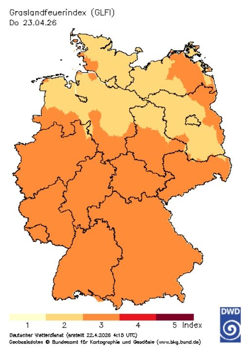Ein Blick auf die aktuelle Graslandfeuerindexkarte des Deutschen Wetterdienstes (DWD) vom Donnerstag zeigt bereits in weiten Teilen des Landes die Gefahrenstufe 3, was einer mittleren Brandgefahr entspricht. Diese Einstufung verdeutlicht, dass bereits relativ leicht entzündliche Bedingungen herrschen und insbesondere unachtsames Verhalten schnell zu Bränden führen kann.