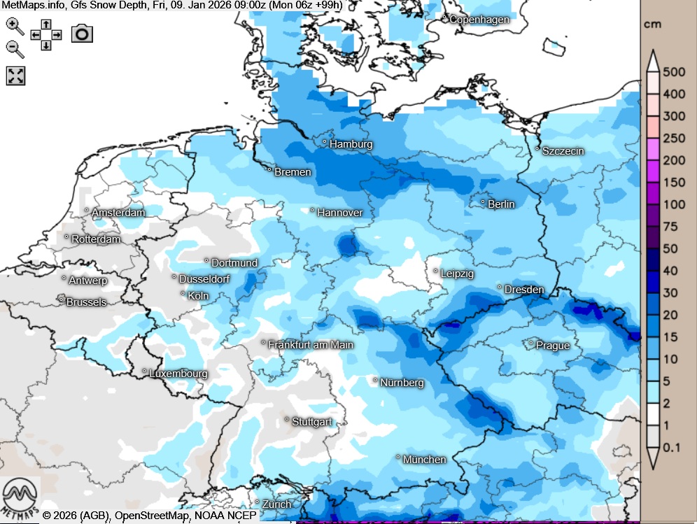 Schneehöhe Freitagmorgen (09:00 Uhr) nach GFS.