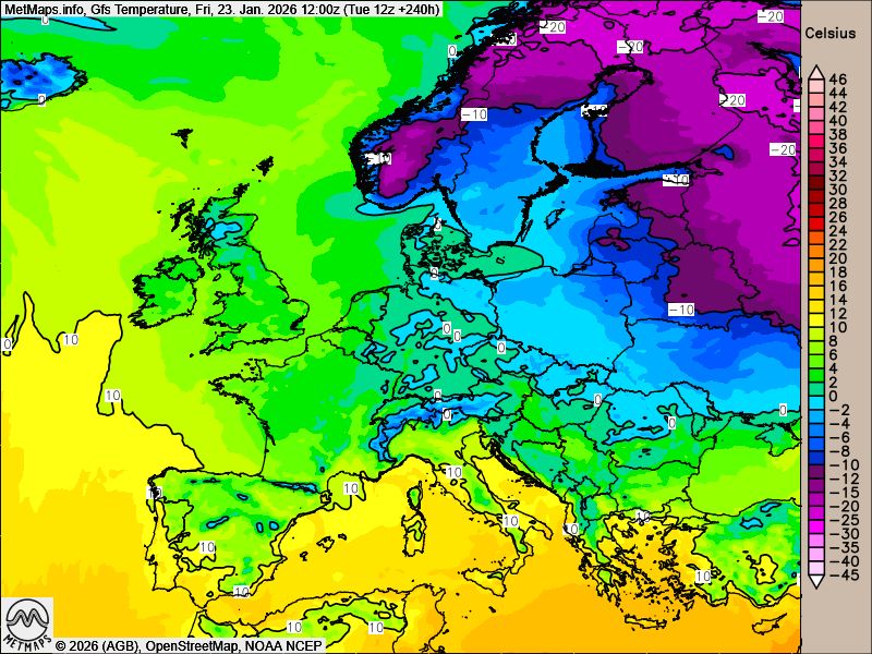 Die Europa-Temperaturen am 23.01.2026 (12:00 Uhr) nach GFS: