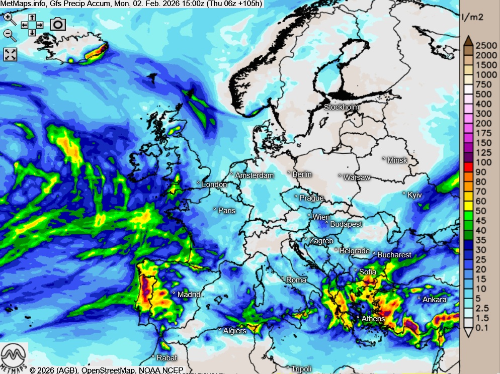 Die akkumulierten Regenmengen nach GFS bis zum 02.02.2026: