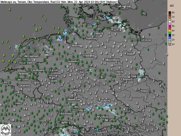 Die erste Karte zeigt die Tiefsttemperaturen in der Nacht auf Montag (03:00 Uhr), die zweite die Minima in der kommenden Nacht auf Dienstag. Auch nächste Nacht ist verbreitet mit Boden- und Luftfrost zu rechnen, lokal wird es sogar nochmals ein paar Grad kälter.