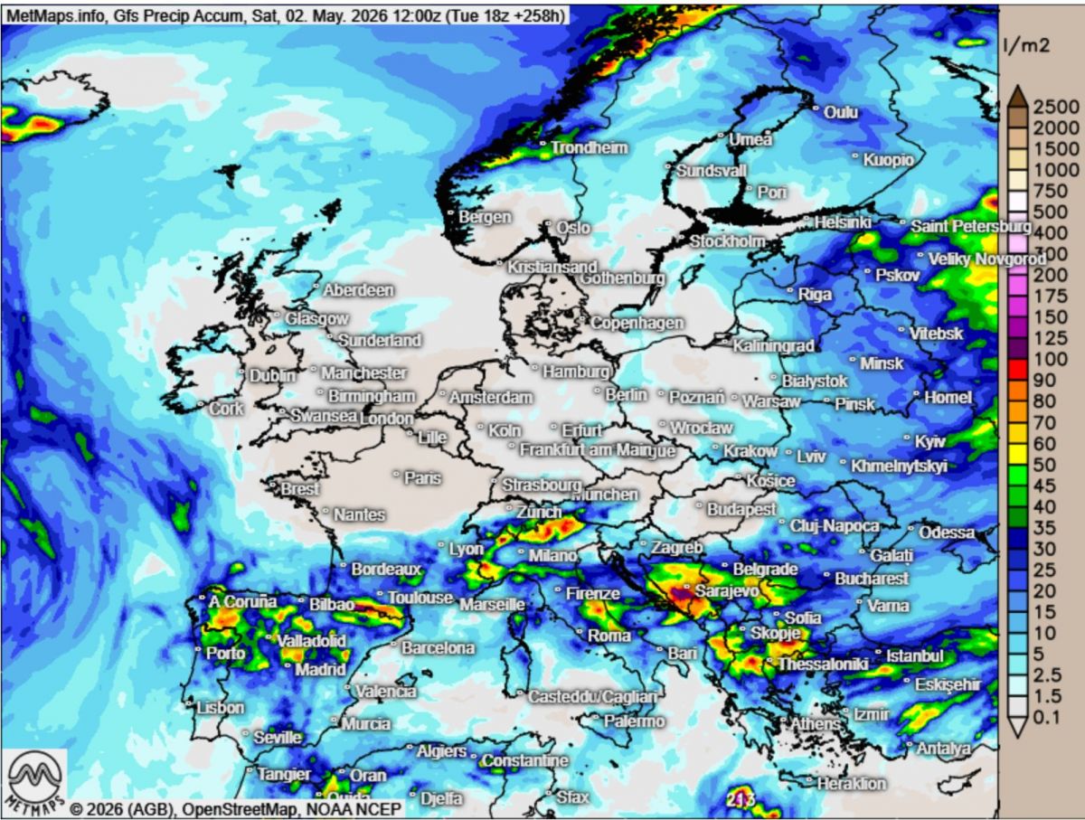 Akkumulierte Regenmengen Europa bis 02.05. nach GFS