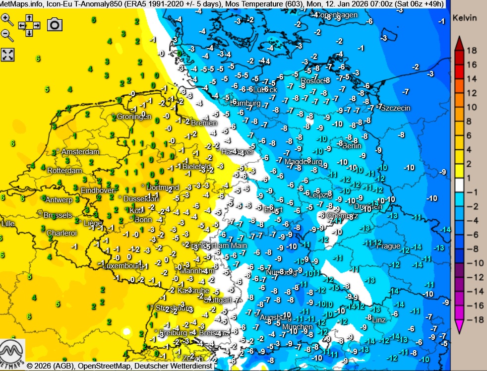 Die Temperaturabweichung für Montagfrüh mit dem "Kampf der Luftmassen" sowie die Lufttemperaturen am Mittwochmittag nach ICON:
