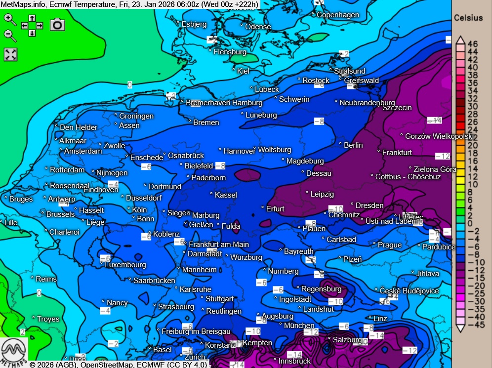 Lufttemperaturen 23.01.2026 (06:00 Uhr) nach ECMWF