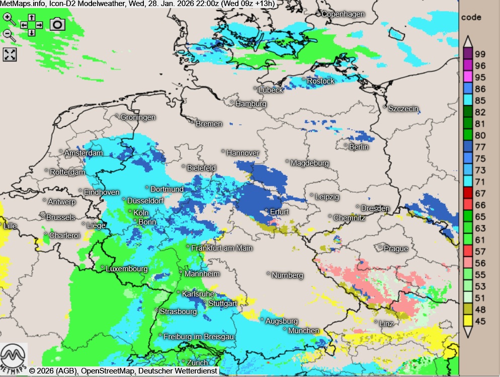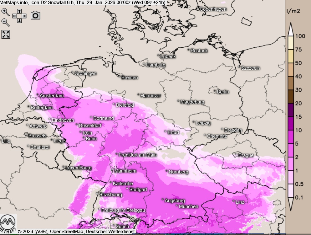 Die aktuellen Berechnungen nach ICON-D2 mit Schnee und Regen für 17:00 Uhr, 20:00 Uhr und 22:00 Uhr sowie die Sechs-Stunden-Schneemengen bis Donnerstagfrüh (06:00 Uhr):