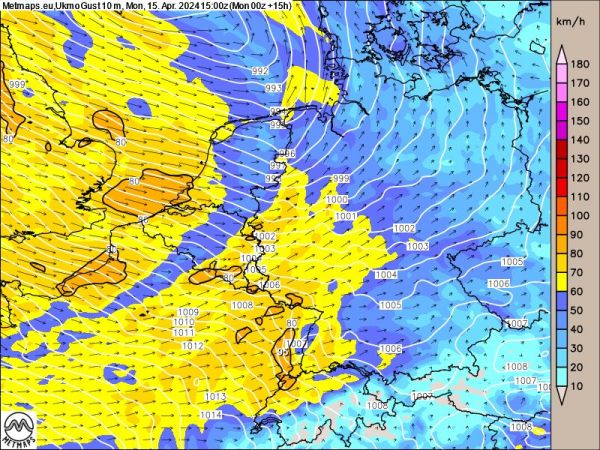Heute Nachmittag etwa sind in der gesamten Westhälfte bis runter in den Schwarzwald Böen bis 80-85 km/h möglich. Da die Bäume belaubt sind, kann auch mal ein Ast brechen.