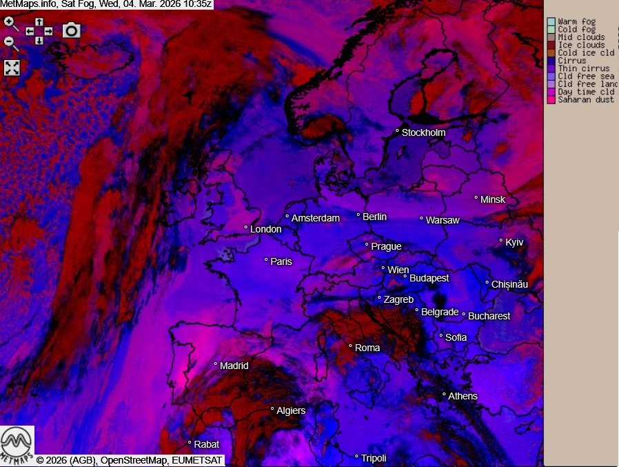 Satellitenaufnahmen von heute Vormittag zeigen den feinen Staub (pinke Flächen) aktuell vor allem über Südeuropa, besonders über Spanien und Portugal: