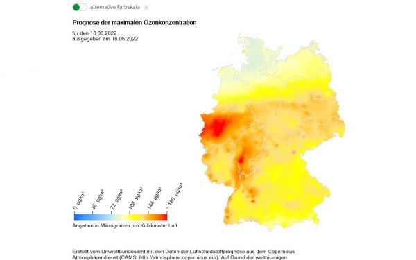 Vor allem im Westen und Südwesten prognostiziert das Umweltbundesamt für den morgigen Samstag deutlich erhöhte Ozonkonzentrationen: