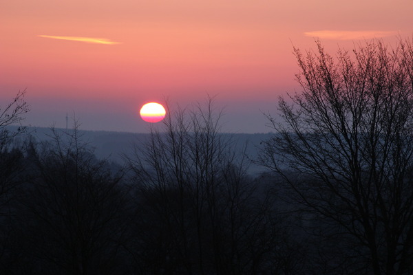 Die Sonne geht über Deutschland auf. Die Aufnahme von Samstag Morgen ca. 6.20 Uhr zeigt schön die verschiedenen Dunstschichten der Atmosphäre. Die Sonnenstrahlen müssen am Horizont durch die dichte kompakte Luftmasse scheinen, daher wird von den Sonne der untere Teil stärker 'geschluckt', als der obere Teil, der schon durch dünnere Schichten scheint. Durch die Streuung an den Sauerstoffatomen wird der Himmel blau. Bis zu 20 Stunden Sonne gibt es am Wochenende.