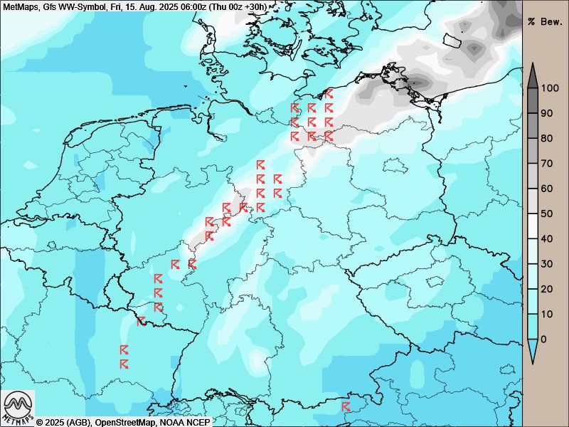 Die Wetterkarten für Donnerstag (12:00 Uhr) und Freitag (06:00 Uhr) mit lokalen Gewittern (rote Symbole) nach GFS:
