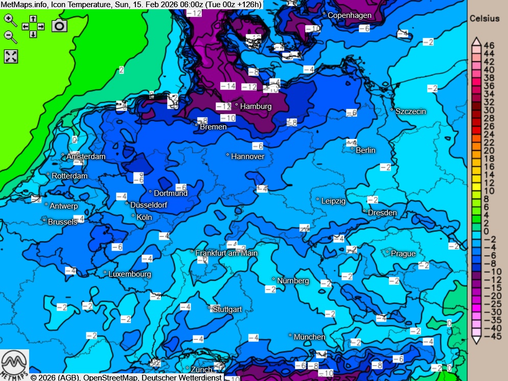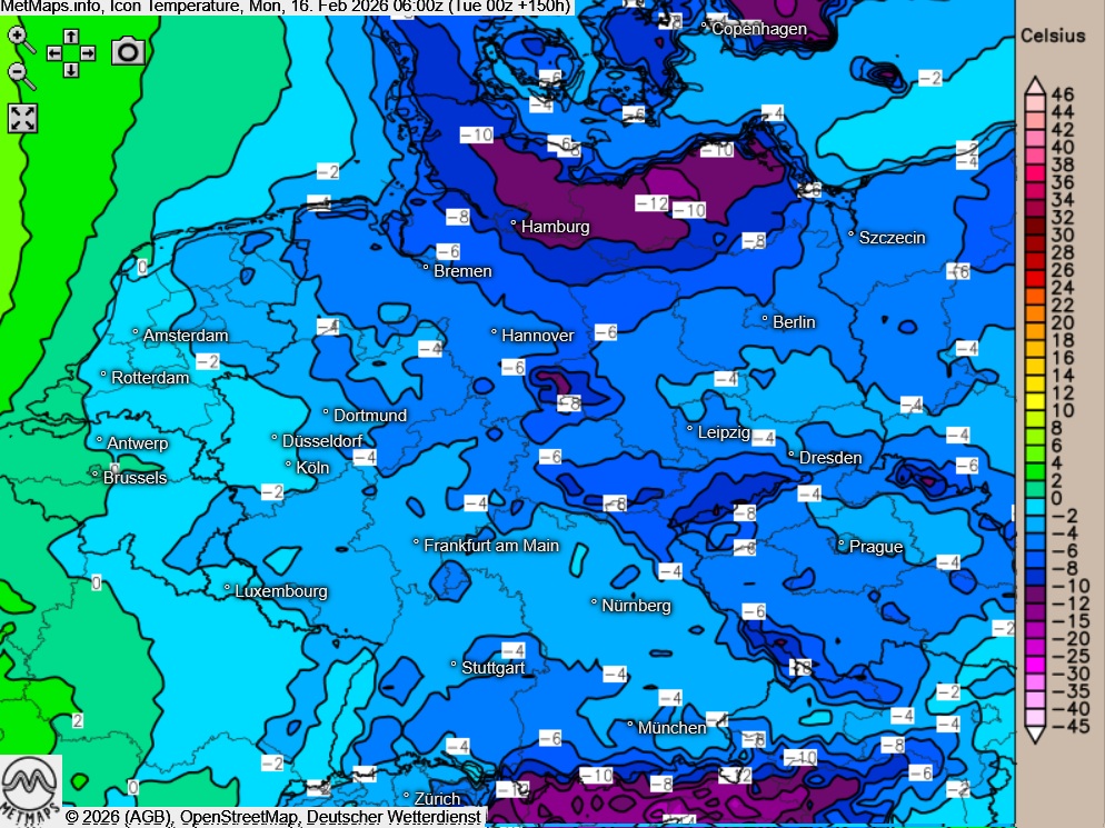 Der Sonntag verläuft insgesamt sehr kalt. Und auch zum Wochenbeginn bleibt die Wetterlage winterlich: Für den Rosenmontag sind erneut verbreitet niedrige Temperaturen möglich, regional sogar mit Dauerfrost. Vereinzelt kann es auch dann noch zu Schneefällen kommen.