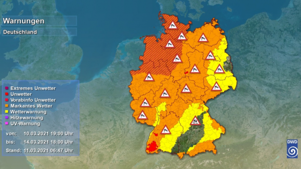 Aktuell sind die Auswirkung von Sturmtief "Klaus" bereits im Westen und Nordwesten Deutschlands spürbar. Im Vormittagsverlauf ist hier mít Spitzenböen um 70 bis 90 km/h zu rechnen. An der Nordseeküste etwa können die Windgeschwindigkeiten im Tagesverlauf auch deutlich darüber liegen, selbst orkanartige Böen oder Orkanböen um 110 km/h sind hier möglich. Für den Nordwesten sind aktuell entsprechende Unwetterwarnungen aktiv (s. Karte).