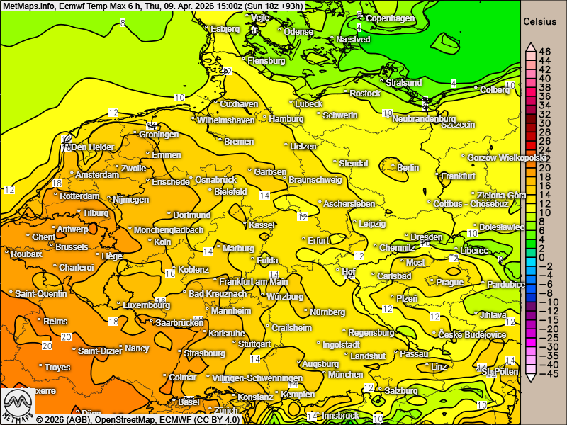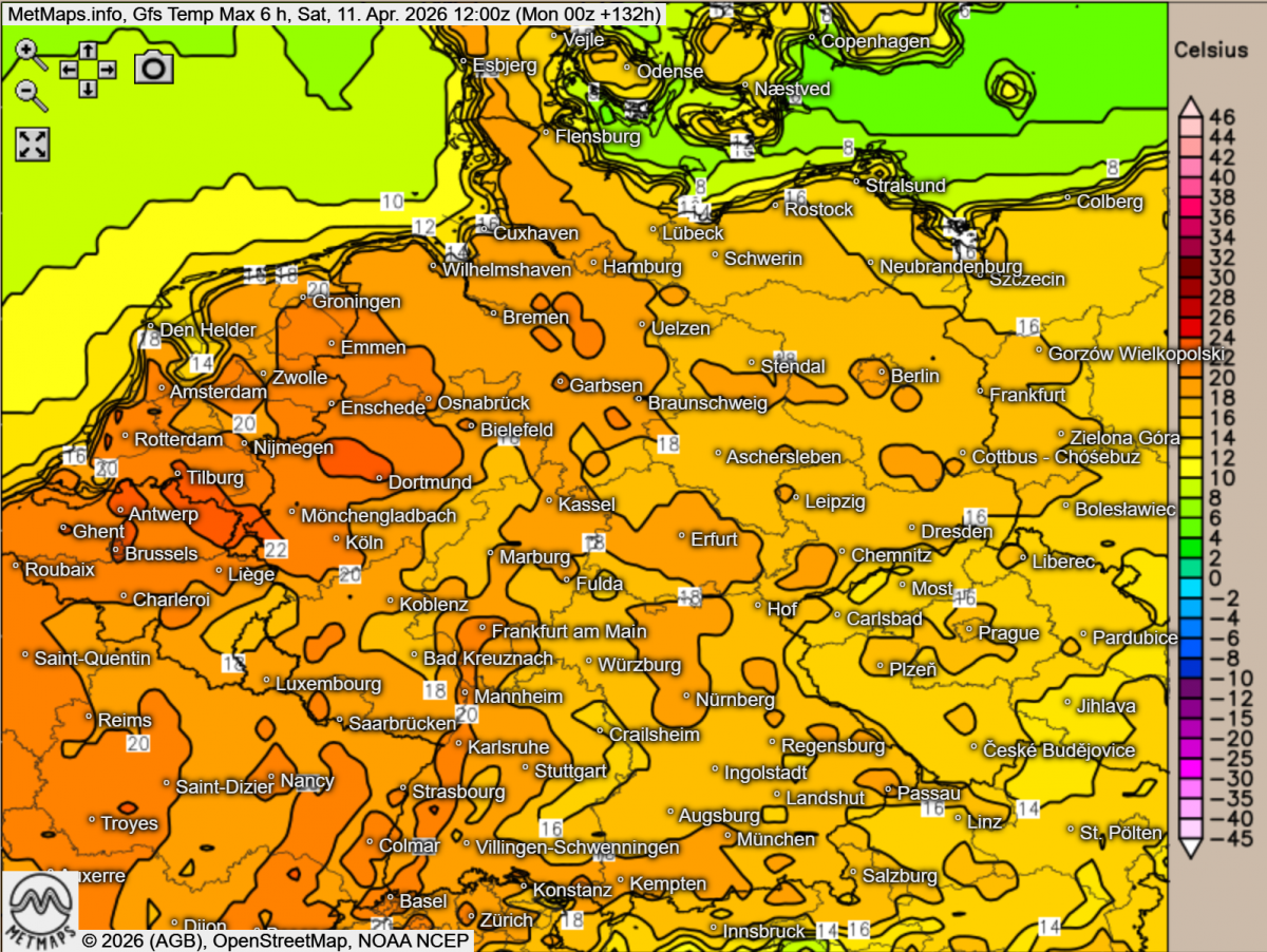 Früher ein Thema für den Mai, heute klassisch im April. Während die meisten Modelle über 20 Grad C für Mittwoch oder auch noch am Donnerstag im Westen und Südwesten von Deutschland erwarten, setzt GFS für den Samstag auf 23-25 Grad C. Nach dem Hauptlauf hat besonders #NRW große Chancen. Warten wir es mal ab. Auf jeden Fall bleibt es jetzt sonnig. Hier ECMWF mit dem Max-Werten am Donnerstag und GFS mit dem Samstag.