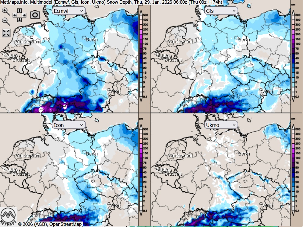 Wie die unterschiedlichen Wettermodelle die Situation für die kommende Woche einschätzen, zeigt die Multimodellprognose der Schneehöhen für Donnerstag, den 29. Januar 2026.