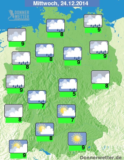 Wer an Heiligabend einen Regenschirm unter dem Baum findet, kann diesen nach der Bescherung häufig schon mal eingehend testen. Teils kräftiger Regen ist am Mittwoch nämlich vor allem im Westen und Nordwesten möglich. Freundlicher zeigt sich der 24. allein im Süden. Die Höchstwerte liegen bei 5 bis 9 °C.