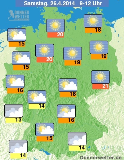 Am Samstag (siehe Karte oben) lacht die Sonne in weiten Teilen Deutschlands mit seltenen Schauern und Gewittern. Bis zu 22 Grad C werden nochmals erreicht.
