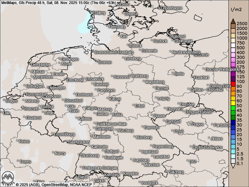 Die Wind- und MOS-Temperatur-Karte für Freitagmittag /-nachmittag sowie die 48-Stunden-Regenmengen bis Samstag nach GFS:
