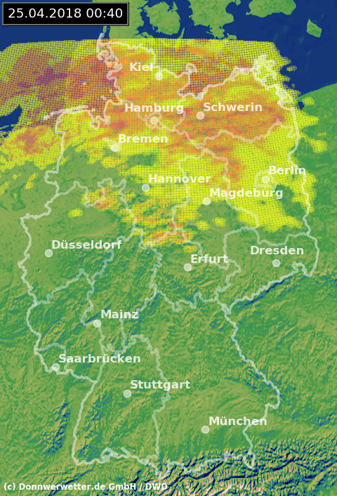 Heute fällt im Norden und in der Mitte gelegentlich Regen, oder es treten Schauer auf. Die Niederschlagsmengen liegen meist zwischen 5 und 15 Liter pro Quadratmeter. Im Süden bleibt es überwiegend niederschlagsfrei.