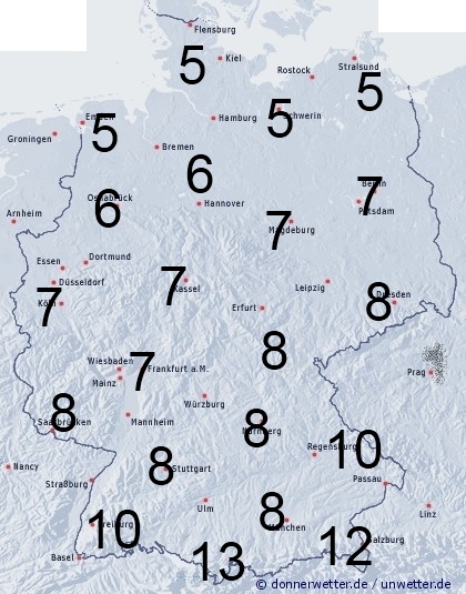 In Deutschland treten gebietsweise Niederschläge auf, die im Bergland teilweise als Schnee und in den Niederungen als Regen fallen. Sonst entsteht Benetzung durch Feuchtigkeit wie Tauansatz. Die Benetzungsdauer liegt allgemein zwischen 5 und 10 Stunden, an den Alpen auch mehr. Bei einer vorhandenen Schneedecke in den Bergen können bis zu 24 Stunden erreicht werden.