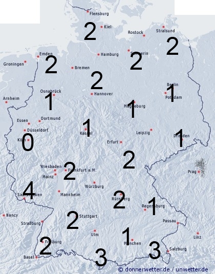 Vor allem im Norden, in der Mitte und im Südwesten kann es zu einigen Regengüssen, oder Gewittern mit einer Benetzungsdauer zwischen 2 und 4 Stunden kommen. Sonst entsteht leichte Benetzung nur durch nächtlichen Strahlungstau.