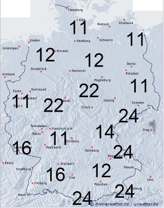 Wir stellen die Blattbenetzung generell in Stunden pro Tag auf der Karte dar. Durch die Lage des Feldes kann die Benetzungsdauer allerdings variieren.
