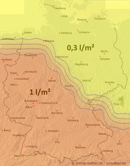 Das Radarbild zeigt das schmale Regenband der Kaltfront im Nordwesten mit teils kräftigen schauerartigen Regen. Diese Front wandert unter Aktivierung allmählich nach Südosten und wird etwa gegen Abend die Alpen erreichen. Dort bleibt sie stationär und sorgt für Dauerniederschläge, wobei die Schneefallgrenze wieder unterhalb von 1000 m sinken kann. Verbreitet fallen in Deutschland zwischen 2 und 10 Liter Niederschlag / m². In der Nacht auf Mittwoch und am Mittwoch sind im Alpenvorland zwischen 10 und 20 Liter Niederschlag / m² zu erwarten. Im Norden stellt sich Wetterberuhigung ein.