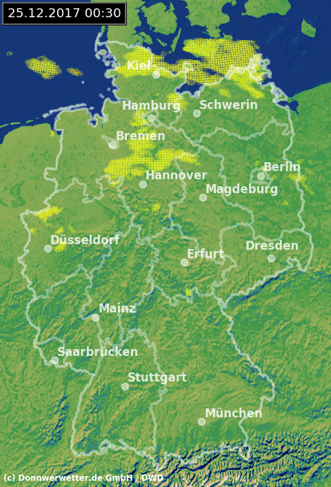 Am zweiten Weihnachtsfeiertag regnet es im Westen und Norden wieder häufiger, dabei sind Niederschlagsmengen zwischen 1 und 8 Liter zu erwarten.