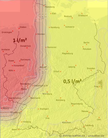 Währenddessen drückt Tief "Maren" kühlere und feuchtere Meeresluft über die Nordsee nach Deutschland. Die Ausläufer dieses Tiefs erreichten auch gestern die Nordhälfte des Landes und sorgten ab dem frühen Nachmittag in einem Streifen vom Münsterland bis zur deutsch-polnischen Grenze für einige Regenfälle. Insbesondere in Schleswig-Holstein regnete es mitunter auch kräftig.