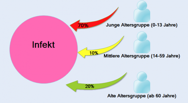 Möchte man die Wahrscheinlichkeit einer Ansteckung auf eine Altersgruppe übertragen, sind es aber vor allem Kinder und Kleinkinder die den Infekt "in die Welt hinaustragen": Bis zu 70% der ansteckenden Grippeviren kommen nämlich von unserem Nachwuchs, auf die mittlere, zahlenmäßig deutlich größere Schicht, entfallen dagegen nur 10%. Die Generation 60+ nimmt mit einer Übertragungswahrscheinlichkeit von 20% den zweiten Platz ein.