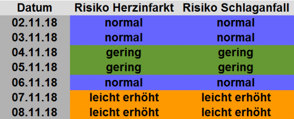 Bei dem anstehendem ruhigen Hochdruckwetter sind die Herzinfarkt- und Schlaganfallrisiken sehr gering. Die Wetterlage bleibt bis Mitte der nächsten Woche bestehen. Erst ab dann sind mit leicht erhöhten Risiken zu rechnen.