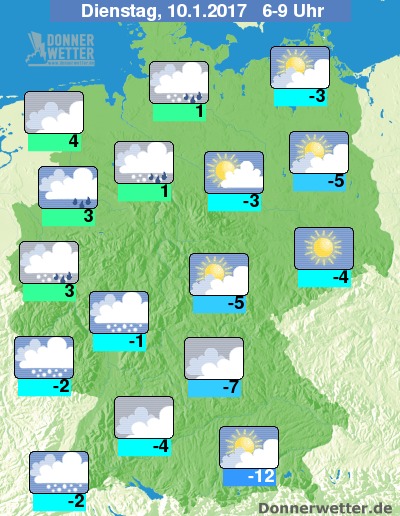 Die Temperaturen erreichen Höchstwerte um 1 Grad C im Thüringer Wald und um 5 Grad C im Rheinland.