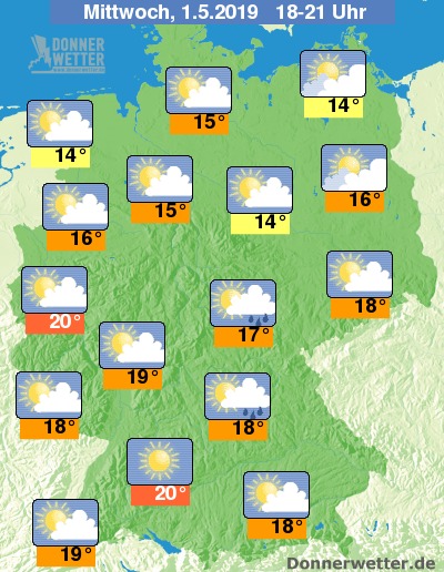 Die Temperaturen bewegen sich am frühen Abend meist zwischen 14 Grad in Teilen von Norddeutschland und milden 20 Grad in Schwaben und rund um Köln.