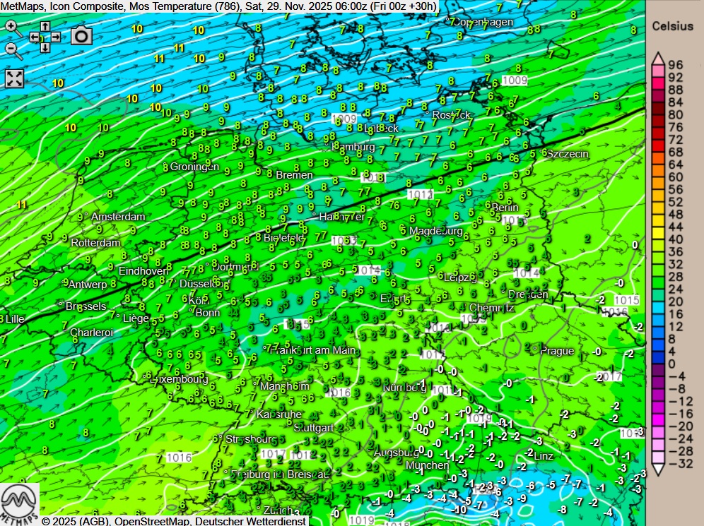 Die Temperaturen erreichen am Samstag Höchstwerte um 0 Grad im äußersten Südosten und 10 Grad im Nordwesten.
